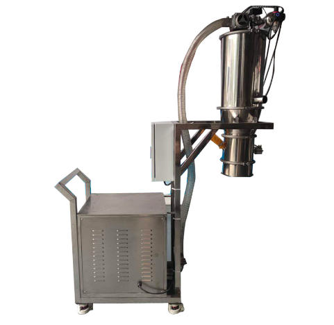 真空上料機是用真空泵抽氣,使吸料嘴進口處及整個系統(tǒng)處于一定的真空狀態(tài),粉粒料隨同外界空氣被吸入料嘴,形成料氣流,經(jīng)過吸料管到達(dá)料斗,在料斗中進行氣、料分離。分離后的物料進入受料設(shè)備。輸送、放料是通過氣動三通閥不斷地開、閉來完成的,而氣動三通閥的開閉是由控制中心來控制的。 ZKS 真空上料機中裝有壓縮空氣反吹裝置,每次放料時,壓縮空氣脈沖反吹過濾器,把吸附于過濾器表面的粉末打落下來,使吸料能正常運行。